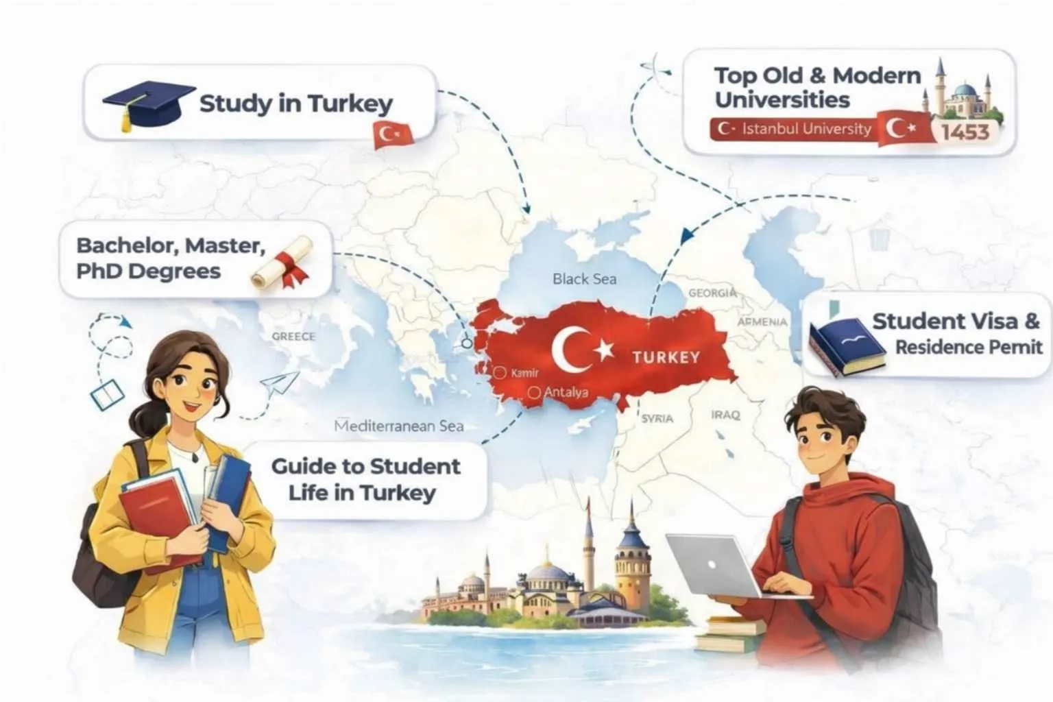 اكتشف أفضل الجامعات والبرامج الدراسية في تركيا، وتعرّف على تكاليف الدراسة والمعيشة وخطوات التقديم بالتفصيل. نوفر لك محتوى موثوقًا وشاملًا يساعدك على التخطيط لمسارك الدراسي واتخاذ قراراتك بثقة.